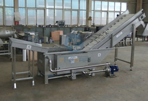 該機由機架、水箱、風機、提升機、氣泡管、噴水管等幾部分組成,工作時由於水中風力的存在,蔬果在水中任意方向翻滾轉動,並在高壓水力的推動下向前移動,在出料口由一刮板提升機,將果蔬送至下道工序。整體為分體式結構,水箱與輸送機、進出料鬥、罩板方便拆卸,易於清洗和檢修。