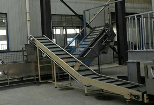 浮在水麵的輕物質經由翻板推送到出料輸送帶,往水下沉的重物質,有槽底部的輸送帶是從另外的一端輸送提升到滾筒清洗機當中,重物質當中的小顆粒雜質是會從滾筒清洗機當中的滾筒當中漏下,往水下沉,沉到水選清洗一體機的底部輸送帶上麵,經由輸送帶從另外的一端輸送出去,清洗之後的物料經由清洗機本身所帶的提升機到抗壓分離機當中來進行榨汁。